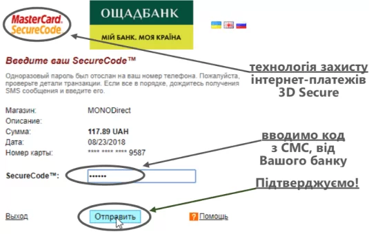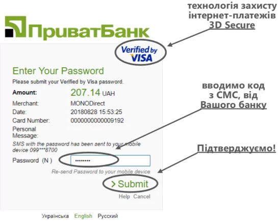 Для підтвердження переказу на екрані з’явиться форма-запиту від Вашого банку, у цю форму Вам потрібно буде ввести код-підтвердження із СМС- повідомлення, що отримаєте від банку. Тільки після цього підтвердження Ваш банк проведе оплату, переконавшись що це робити особисто Ви, бо правильно введено номер картки та всі її данні, правильно введено код-підтвердження, який банк вислав на особистий номер телефону, про який Ви його раніше повідомляли. Якщо Ви не отримали код-підтвердження від свого банку, у Вас не підключено СМС-інформування (кошти з Вашого рахунку не спишуться).