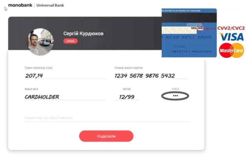 Введить CVV2/CVC2 код Вашої картки (знаходиться на зворотньому боці картки на смужці для підпису – три цифри, або три останні цифри вказаного номеру)